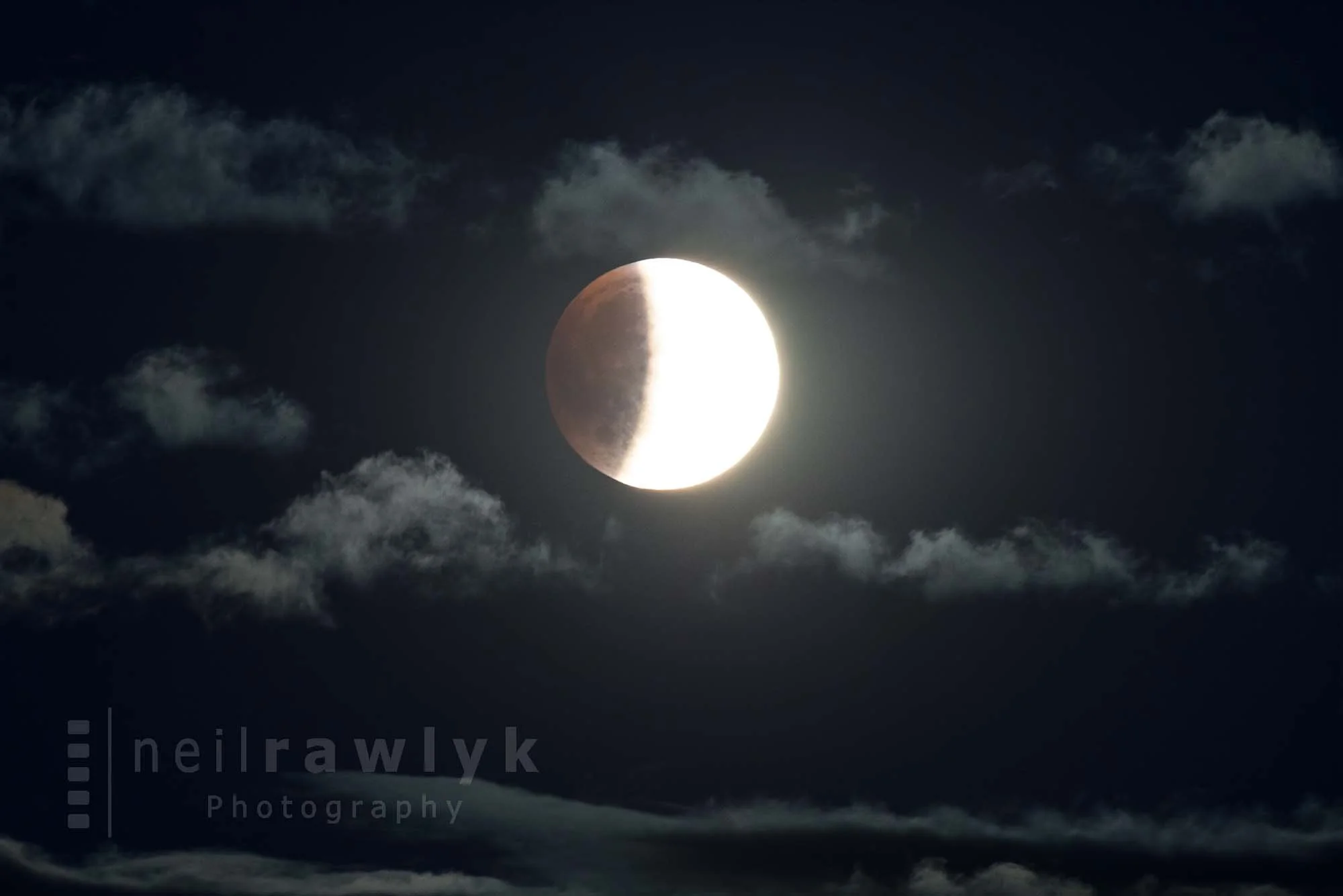 This partially eclipsed moon was the fourth of a tetrad of total lunar eclipses that occurred over two years from 2014-2015. I had wanted to capture the moon as it rose above the horizon but cloudy skies foiled my plans. I remained hopeful the skies would briefly clear. They did.
